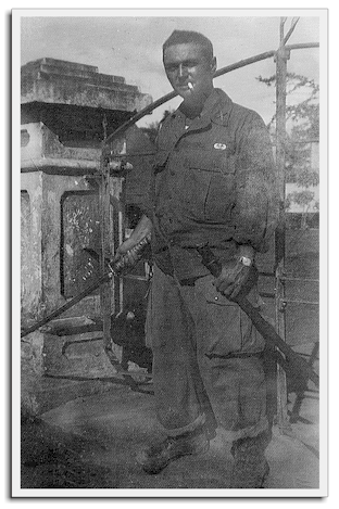 There is a mendacious tale of Turpin's death related by one writer who tells of observing it from high ground. "B" Company was far away northeast of Fabrica. I had two reinforced platoons of "F" Company miles below Fabrica. Bugang Lumber Camp was at the junction of the main line running north-south and a spur running to the east. The camp was adjacent the rail lines. Insular Lumber Company constructed these camps for their employees, consisting of small houses with roofs, sides and floors which could be taken apart and hauled on flat cars to other sites. I do not remember any buildings there. At the site where the camp once stood, I sent the the 1st Platoon under Lt. Mathis to patrol south along the main line toward Malapasoc, and the 2nd Platoon, under Turpin, east to follow a feeder rail line. The platoons are reversed in the "history". The train with the 81mm mortar and the light machine guns waited at the rail junction. Before the 2nd platoon had moved more than a few hundred yards a Filipino civilian approached them and told Lt. Turpin that four Japs were in a nipa hut off to the left of the tracks a few hundred yards further ahead. Following him they turned off the tracks on to a path which lead through the thick underbrush. After going a short distance, the path emerged into a clearing, facing a nipa hut standing in the middle of the clearing. The hut was of the type usual to the area, standing on stilts about four or five feet off the ground. The windows were covered with hinged thatch covers. The lead element halted and stayed low behind a large log. Tony Lopez, the platoon sergeant, wanted to blast the hut with fire, but Turpin disagreed. He told Lopez he'd check the hut himself, "while you have your men cover me." He broke cover and walked out of the clearing towards the hut. Half way towards it, "Blam!" and Turpin is dead. Now the hut is riddled, but it is too late for Turpin. A Jap jumped out of the hut's far side and dashed into the nearby brush. They fired at him but did not know if they hit him. After riddling the hut, they rush in and find the hut's only occupant - a woman who escaped injury by taking refuge in a big, heavily built oven. Lt. Turpin's body was carried back to Fabrica on the train.* At this stage the war still seemed destined to last a long time - there was still the Japanese homeland to be invaded. None of us felt our chances of survival were good. Little did we know that Turpin's death would be the last in "F" Company from enemy action. It just causes those of us who knew him to reflect, sadly, "what if?" |