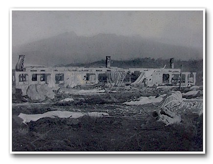 At the far western end of the athletic field which was Landing Field "A", are three buildings which marked the boundary of safe territory. Pre-war, they had been the married quarters for NCO's and enlisted men. On the far side of the buildings, the Japanese were firmly in control and to land there was at a great risk of a mortal wound. . On the eastern side of the building, the troopers of the 503d held sway. There was literally the width of a wall between the opposing sides. Although the Married Qtrs. were two levels, they were down a small embankment facing Beltline Road, and give the impression in this photograph that they are on only a single level. Though the photograph is blurry, it appears that a trooper who has just landed (at the bottom right of the photograph) is commencing to regain his feet.